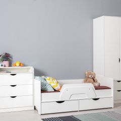 Ваш подрастающий малыш несомненно оценит изящный дизайн кроватки, а удобный съемный бортик придаст уверенность ответственным родителям в безопасности детского сна. Все элементы кровати предусмотрительно избавлены от острых углов и оформлены более толстой кромкой. Выкатные ящики - это вместительная система хранения для вещей и игрушек вашего ребенка. Удобный шкаф для одежды дополнен двумя выдвижными ящиками, что значительно увеличивает функциональность изделия. Комод оснащён складным пеленальным столиком.