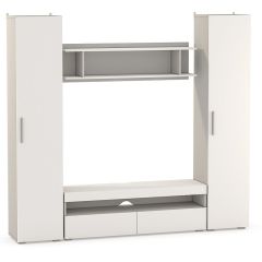 Модный урбанистический дизайн и светлые декоры. Все модули можно собрать в готовую композицию, скрепить между собой, получив жёсткую конструкцию. Тумбы под ТВ может быть укомплектована подсветкой, которая эффектно смотрится в интерьере и подчёркивает широкую нишу, свободную от перегородок. Тумба под ТВ подготовлена для прокладки проводов телевизора и медиа-техники. Большинство фасадов освобождены от лицевой фурнитуры, а ручки на пеналах выполнены из алюминия.